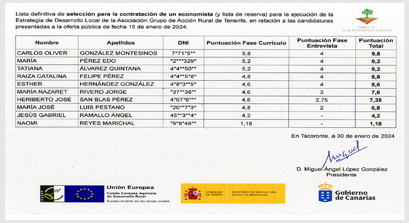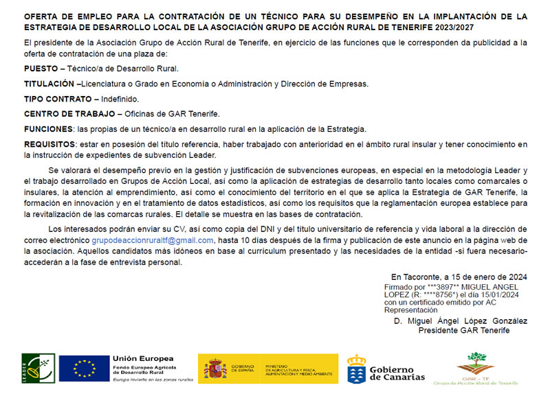 Oferta de empleo para la contratación de un técnico para el desempeño en la implantación de la estrategia de desarrollo local de la asociación Grupo de Acción Rural de Tenerife 2023/2027